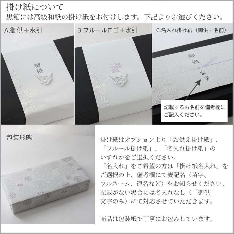 黒箱には高級和紙の掛け紙をお付けします。オプションより「御供」「フルールロゴ」「名入れ掛け紙」のいずれかをご選択ください。