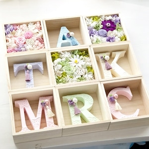 重箱タイプの上段にはプリザーブドフラワーのアレンジメントを下段にはイニシャルアロマストーンをセットしました。